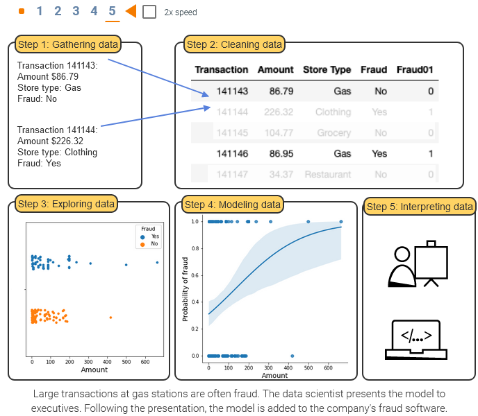 Data analysts work with industry experts to analyze datasets and create visualizations. Data analysts use some data science models, but tend to use data visualization and summary more than modeling. |